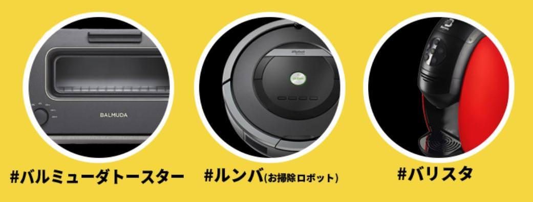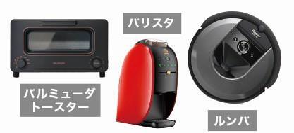 「BALMUDA トースター」「iRobot ルンバ」「Nescafé バリスタ」