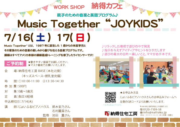 7/16(土)17(日)は「じょいふるピアノハウス」さんによる、0~3歳のお子様とご家族が遊びながら音楽と英語にふれあうプログラム、Music Together®を納得住宅工房富士店にて体験していただけます。