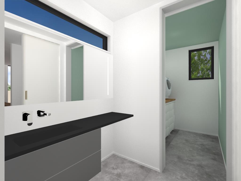 普段使うお風呂・脱衣所・洗面所・ランドリールームを並べて配置した使いやすい動線にもこだわり、子どもが思春期になった際のプライバシーを考えて脱衣所を別にしています。