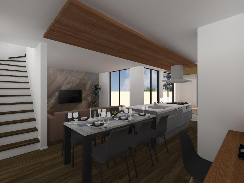 LDK全体をダークブラウンの無垢の床(フレディ)をベースにレザーのソファ、ダイニングテーブルで置き落ち着いた雰囲気のデザイン。家事動線を意識した、どこにいても家族の声が聞こえるお家は、キッチンから庭、リビング、和室を見渡せる間取りになっています。
