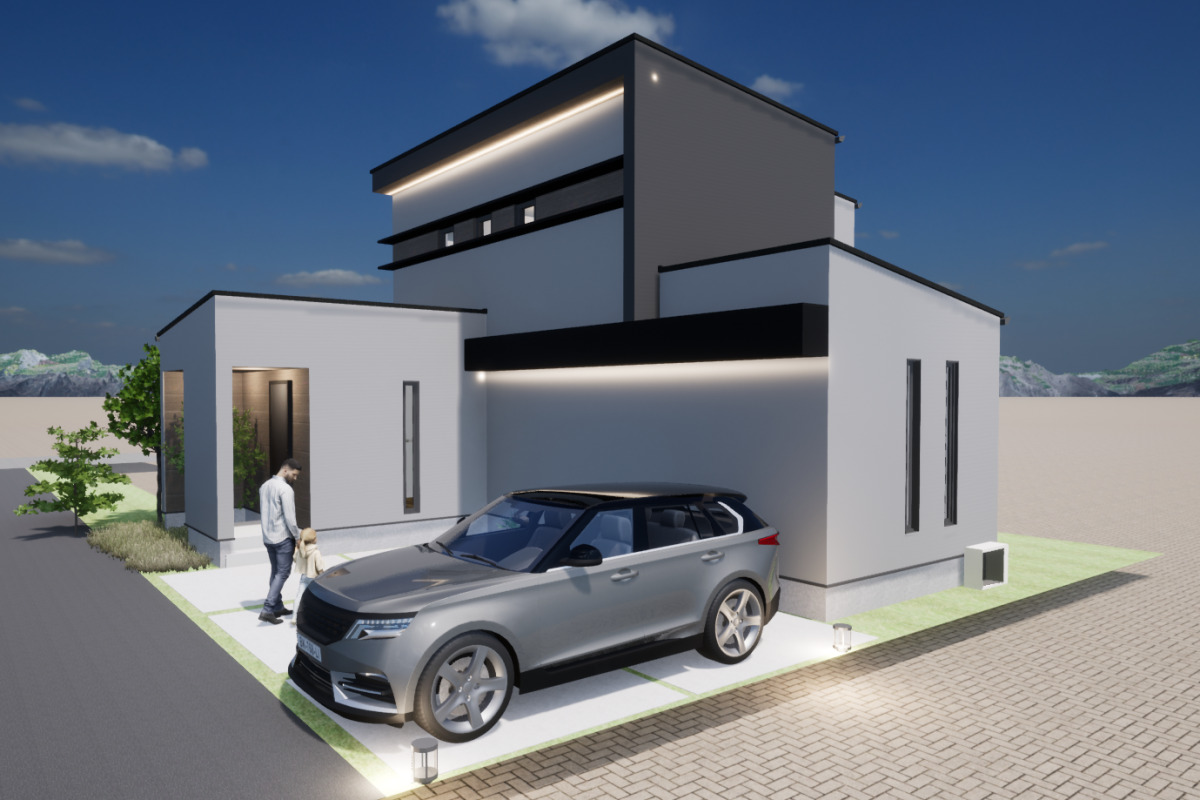 色を使い分けて奥行き感を出し、道路側から見て大きく見えるように設計しました。北側道路の為、南側にプライベートが確保できる庭とウッドデッキを設置したのもポイント。軒下に間接照明を入れ、夜にライン照明が映えるようプランニングしました。