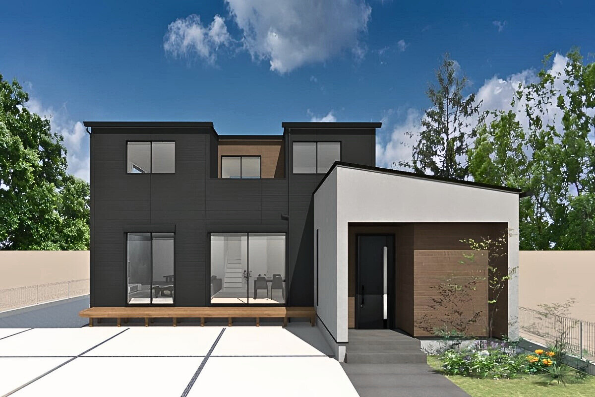 周辺の街並みの色合いに合わせながらも、ご夫婦の好きな「箱型」を採用。2つのボックスをずらすように配置し陰影を生み出しました。玄関ポーチにはアクセントに木目を入れることで個性を表現しました。