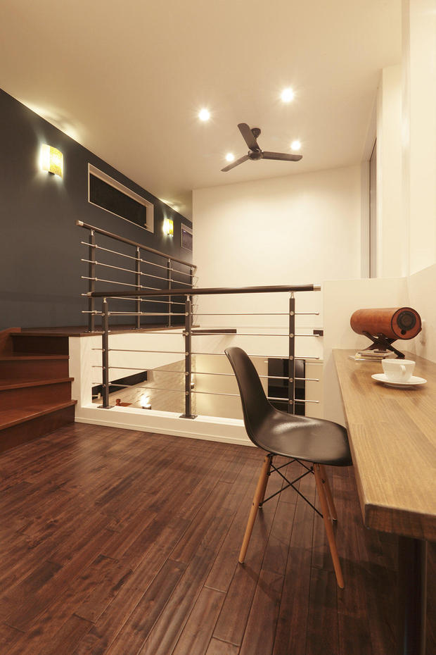 2階の渡り廊下は幅を広く取りファミリースペースに。限られた場所でも壁ではなく格子にしたため圧迫感がありません。椅子や本棚を置いてご家族のコミニュケーションが出来るセカンドリビングとしても活用できます。