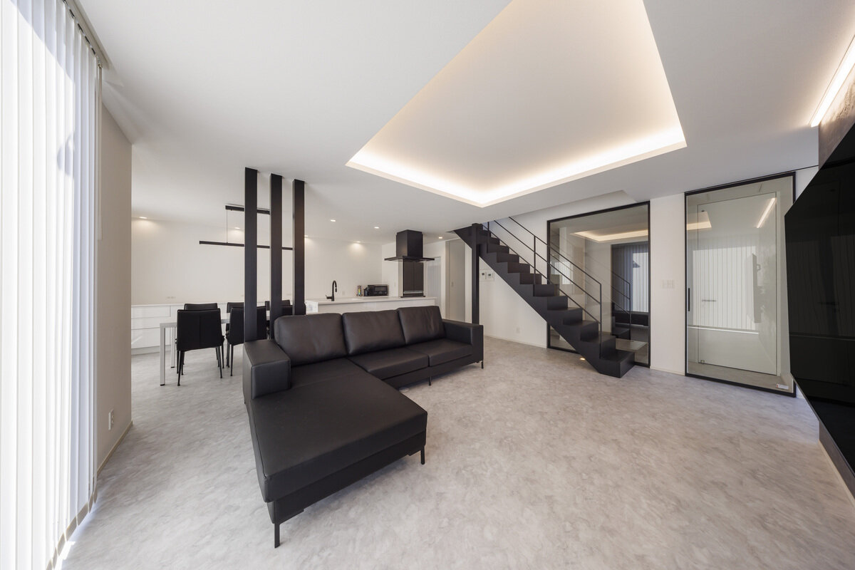 全面をフロアタイルの床にし、ブラックのアイテムが空間を引き締めているリビング。天井の一部を堀り上げ、間接照明を入れることで高さを感じられます。