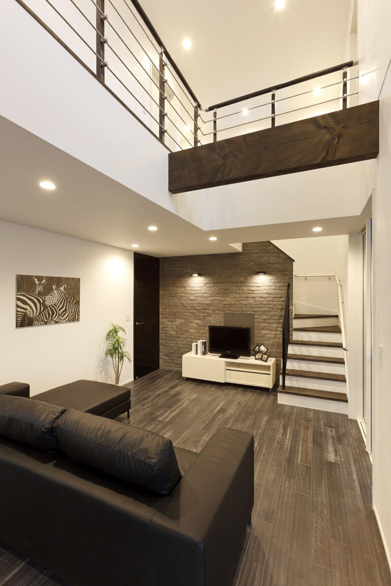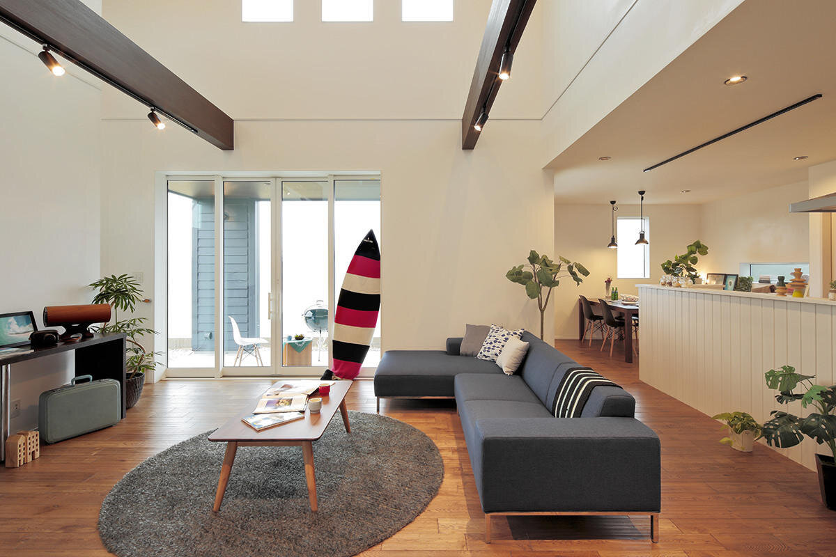 吹き抜け大空間リビングとプライベートテラスの家